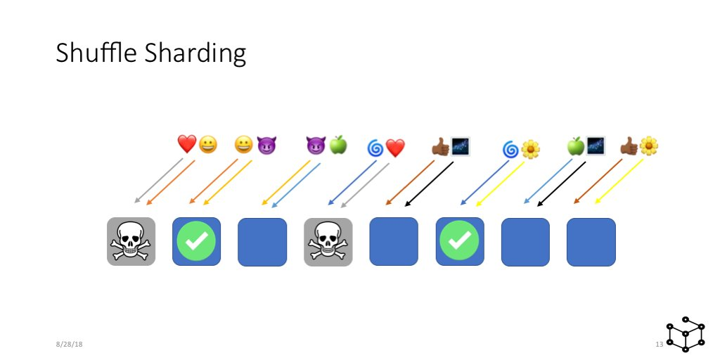 But now, an outage of a single shard or a single misbehaving tenant will affect all the tenants. AWS came up with Shuffle Sharding to mitigate this issue. Colm MacCárthaigh's excellent thread explains it well, and with pictures!