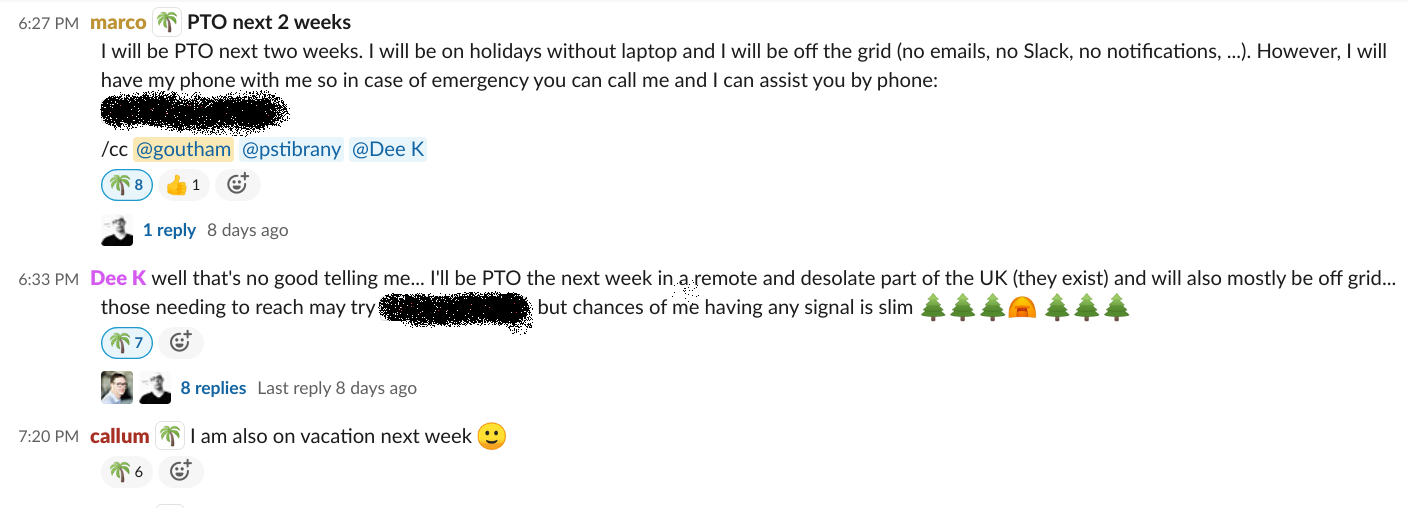 Lead by example! You could have an amazing vacation policy but if you don't take holidays and don't talk about it proudly, you won't see your reports use their holidays. We do a good job of it at Grafana Labs (Dee is my and Marco's manager):