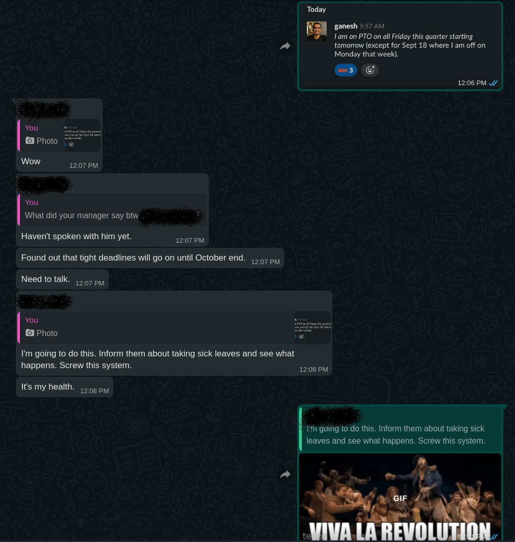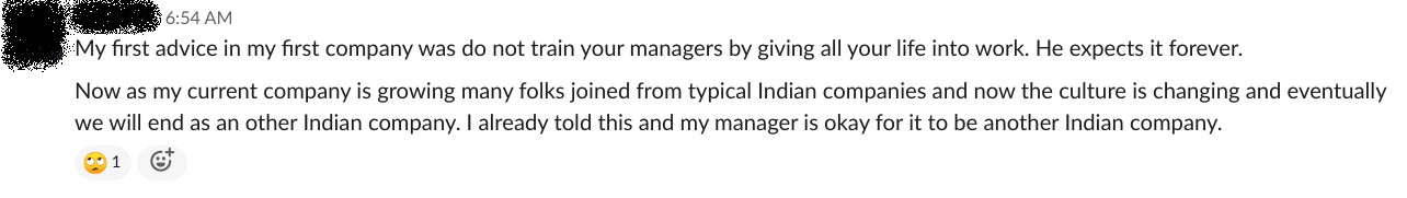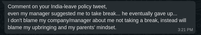 And finally friends, I've asked this on Twitter, and only got back a few Indian companies that have good vacation policy. I'd love to find out more, and maybe even create a list of companies that have generous vacation policy and execution (making sure people are actually taking time off). I'd love to talk to founders and leaders on what they think about a minimum vacation requirement for every employee. Reach out to me on Twitter @putadent.