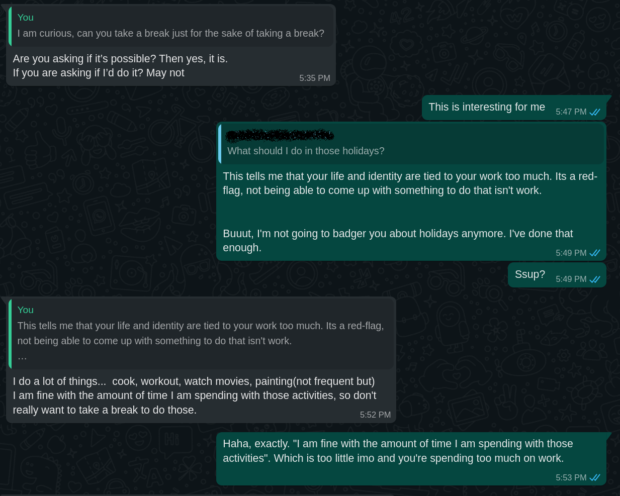 The year after, I started contributing to Prometheus and got an internship at CoreOS, with their Berlin team. I was working remote from home, but I had sane-ish work timings, and this was because most German's log off by 5-6PM and that roughly translated to 9PM. So after 9PM the slack chatter died down and everything went eerily quiet and that made me not want to work. Sometimes I did hang out until late chatting with Fabian, my mentor and the Prometheus community, but it was the rare exception to my schedule. This was all unsettling to me, someone who liked working insanely long hours, especially late into the night. And then came the weekend, and as was customary, I was working. Not on my project directly, but exploring something interesting and tangential. And I posted about it on Slack on Monday (Berlin slack is a ghost town on weekends) and Frederic replied telling me not to work on weekends and that "burnout" is a real problem. And it felt like a stern warning, it didn't offend me but rather made me take it extra seriously. Also, I had to Google what burnout was (In my defense, I was very naive).